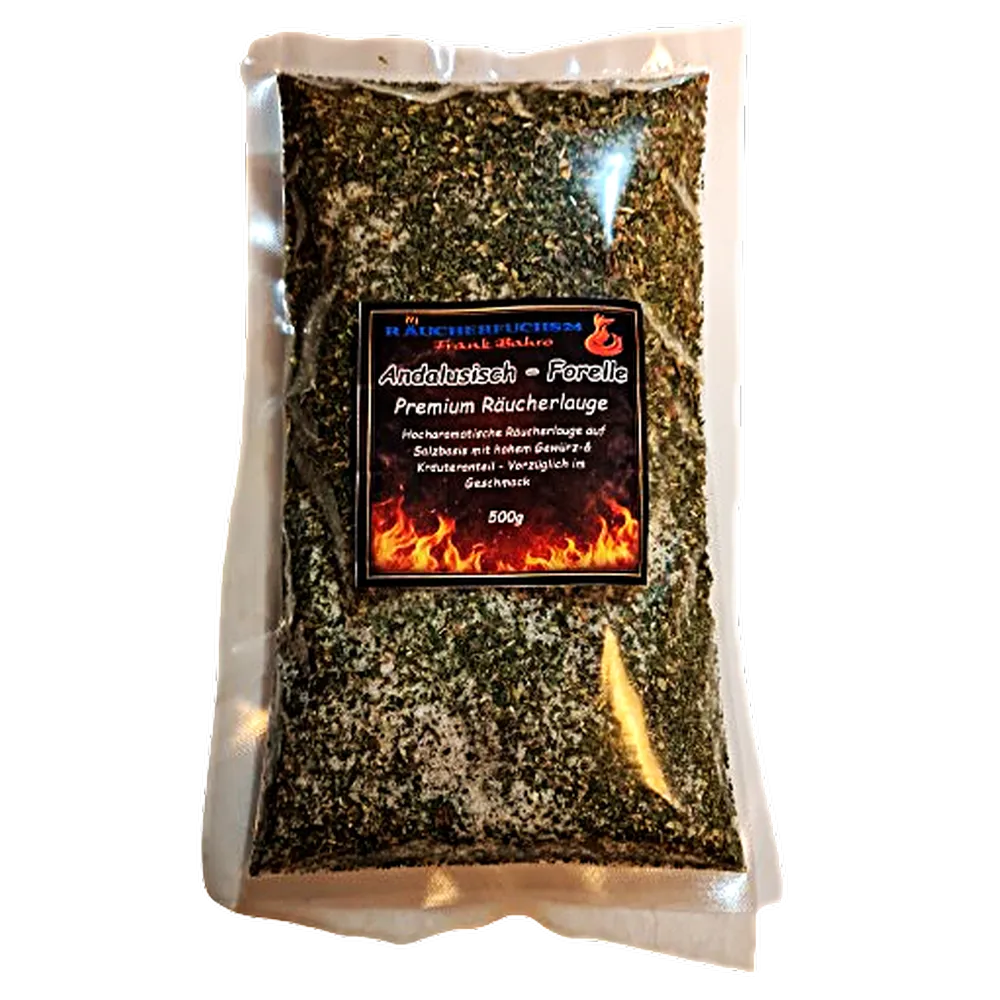 Diese Räucherlauge bringt südliche Würze auf den Teller: Die andalusische Rezeptur basiert auf einer harmonischen Mischung aus Salz, Pfeffer, Kräutern und Gewürzen. Sie verleiht deinem Räucherfisch ein kräftiges Aroma und eine schöne, goldbraune Farbe – ideal für Forelle, Lachs, Saibling oder Hering.