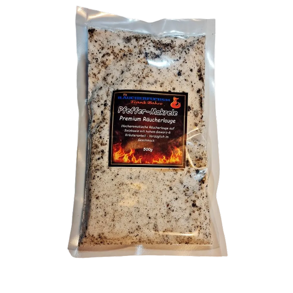 Räucherlauge Pfeffer Makrele 500g – aromatische Räucherlauge auf Salzbasis mit kräftiger Pfeffernote, ideal für würzig-herzhafte Makrelen mit intensivem Räucheraroma.