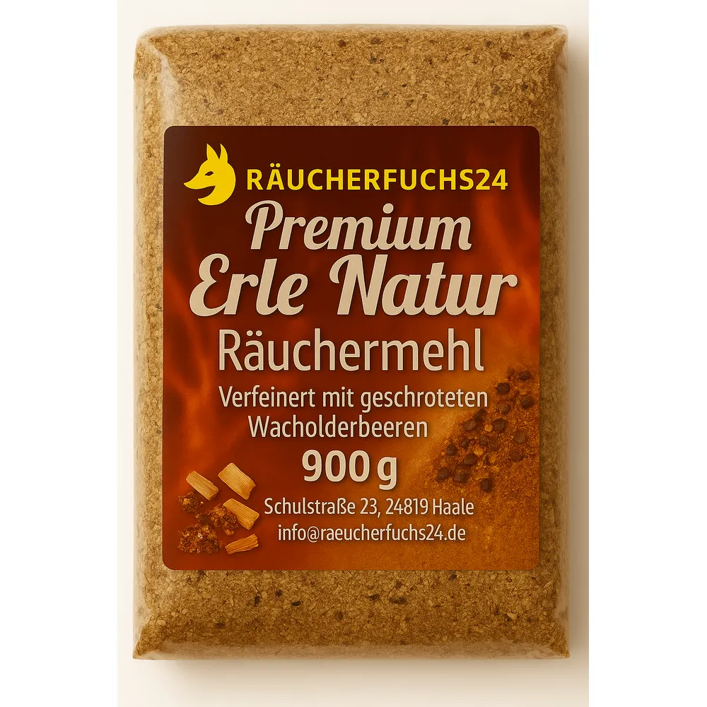 - Inhalt: 900 g Räuchermehl (Erle) mit geschrotetem Wacholder